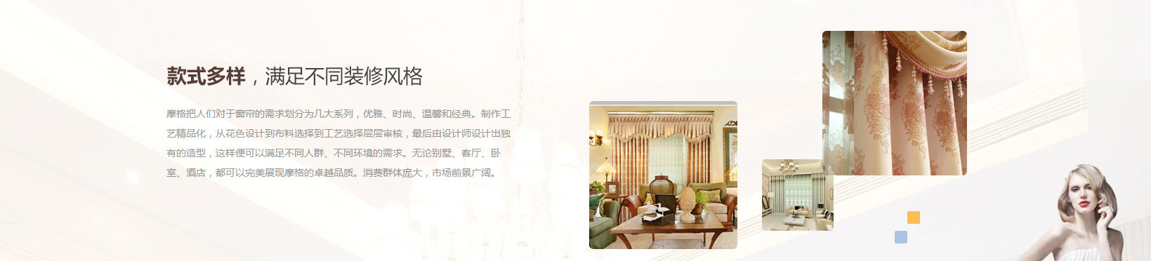 摩格把人們對(duì)于窗簾的需求劃分為幾大系列,優(yōu)雅、時(shí)尚、溫馨和經(jīng)典。制作工藝精品化,從花色設(shè)計(jì)到布料選擇到工藝選擇層層審核,最后由設(shè)計(jì)師設(shè)計(jì)出獨(dú)有的造型,這樣便可以滿足不同人群、不同環(huán)境的需求。無(wú)論別墅、客廳、臥室、酒店,都可以完美展現(xiàn)摩格的卓越品質(zhì)。消費(fèi)群體…